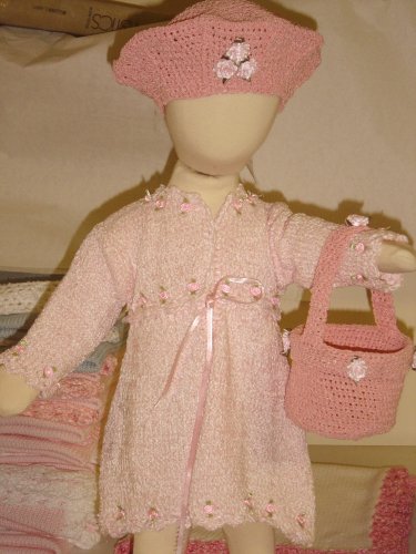 D81eb82, Knitted Baby Pink Chenille Infant Dress Trimmed with Daisies and Carnation Trimmed Hat and Basket Overviews Knitted Baby pink Chenille Infant Dress trimmed with daisies with Carnation trimmed floppy hat and basket. D81eb82, Knitted Baby Pink Chenille Infant Dress Trimmed with Daisies and Carnation Trimmed Hat and Basket Specifications D81eb82, Knitted Baby Pink Chenille Infant Dress Trimmed with Daisies and Carnation Trimmed Hat and Basket Features