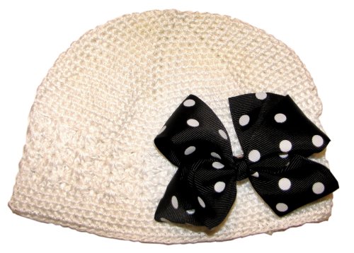 - White crochet beanie hat with removable 4inch Black Polka Dot hair bow