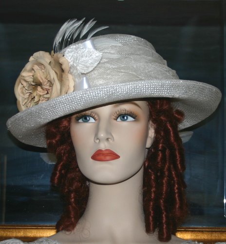 Church Hat Edwardian Style Hat "Lady Amelie" Overviews "Lady Amelie" is designed over a white Ramie Base (Ramie is a Chinese grass that when made into fabric has a beautiful sheen similar to flax). The large au lait colored English cabbage rose is made of fabric with a perfect backdrop of petite coque feathers and white velvet leaves. The ribbon is white satin. The hat band is gorgeous white sinimay or sinamay which gives the hat an airy appearance. This is an Edwardian Hat Style perfect for church, wedding, Easter, Somewhere in Time weekend event, Kentucky Derby or even a Titanic remembered event. Church Hat Edwardian Style Hat "Lady Amelie" Specifications Church Hat Edwardian Style Hat "Lady Amelie" Features